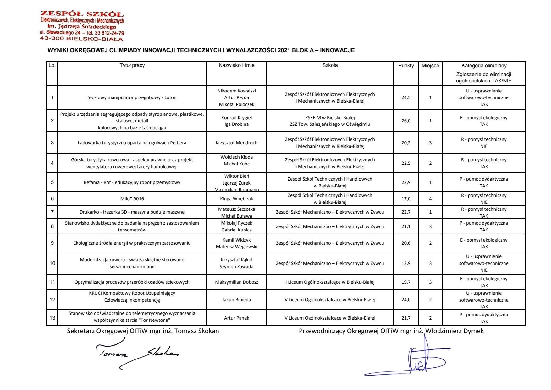 Wyniki Okręgowej Olimpiady Innowacji Technicznych i Wynalazczości 2021 BLOK A "INNOWACJE"