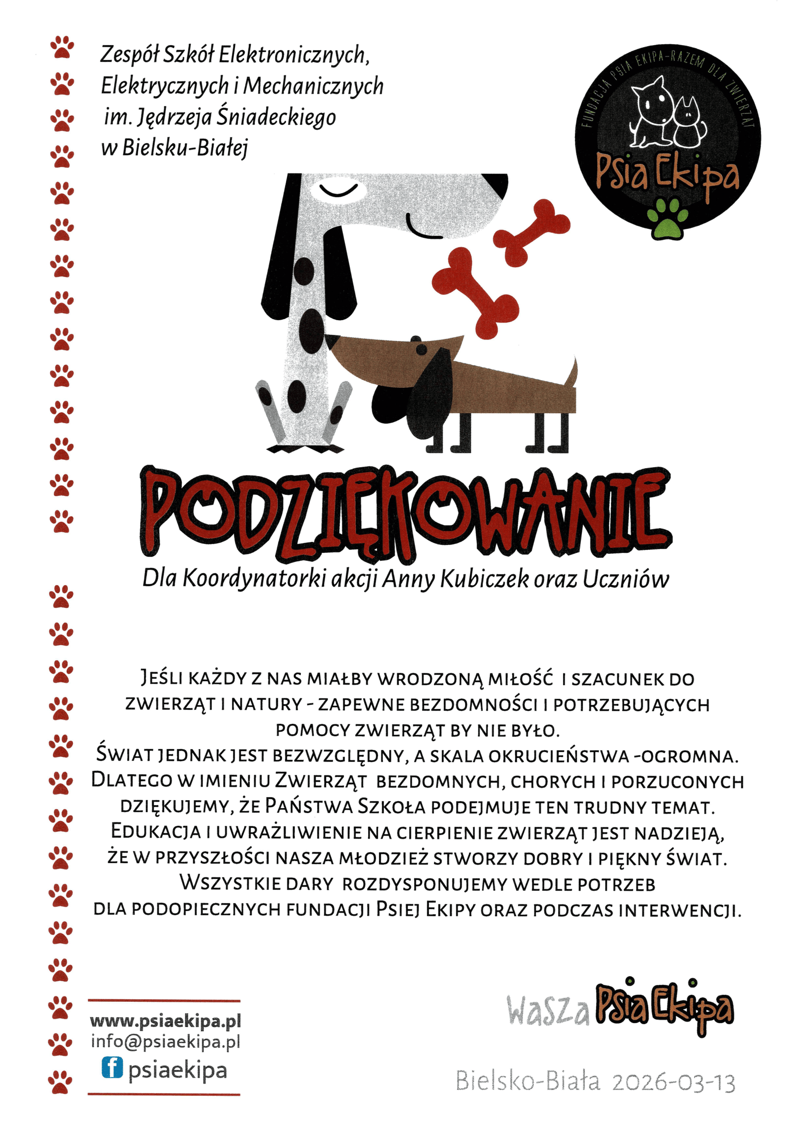 Szczególne podziękowania kierujemy do Uczniów, Rodziców oraz Nauczycieli, którzy aktywnie włączyli się w tę piękną akcję pomocy bezdomnym, chorym i porzuconym zwierzętom.