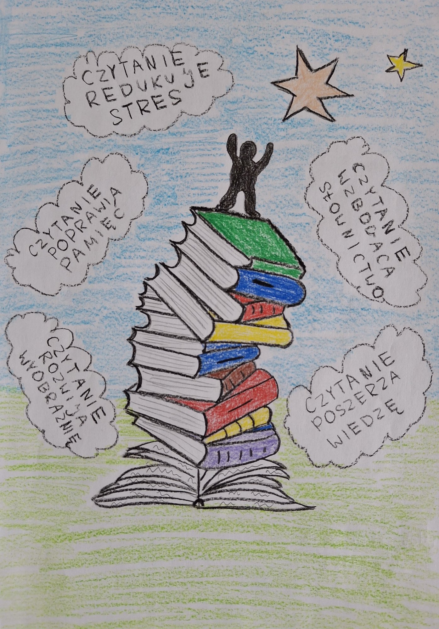 Uczniowie klas pierwszych wzięli udział w konkursie na plakat promujący czytelnictwo wśród młodzieży. Celem konkursu było kształcenie umiejętności tworzenia plakatu oraz rozwijanie zainteresowań i kreatywności.