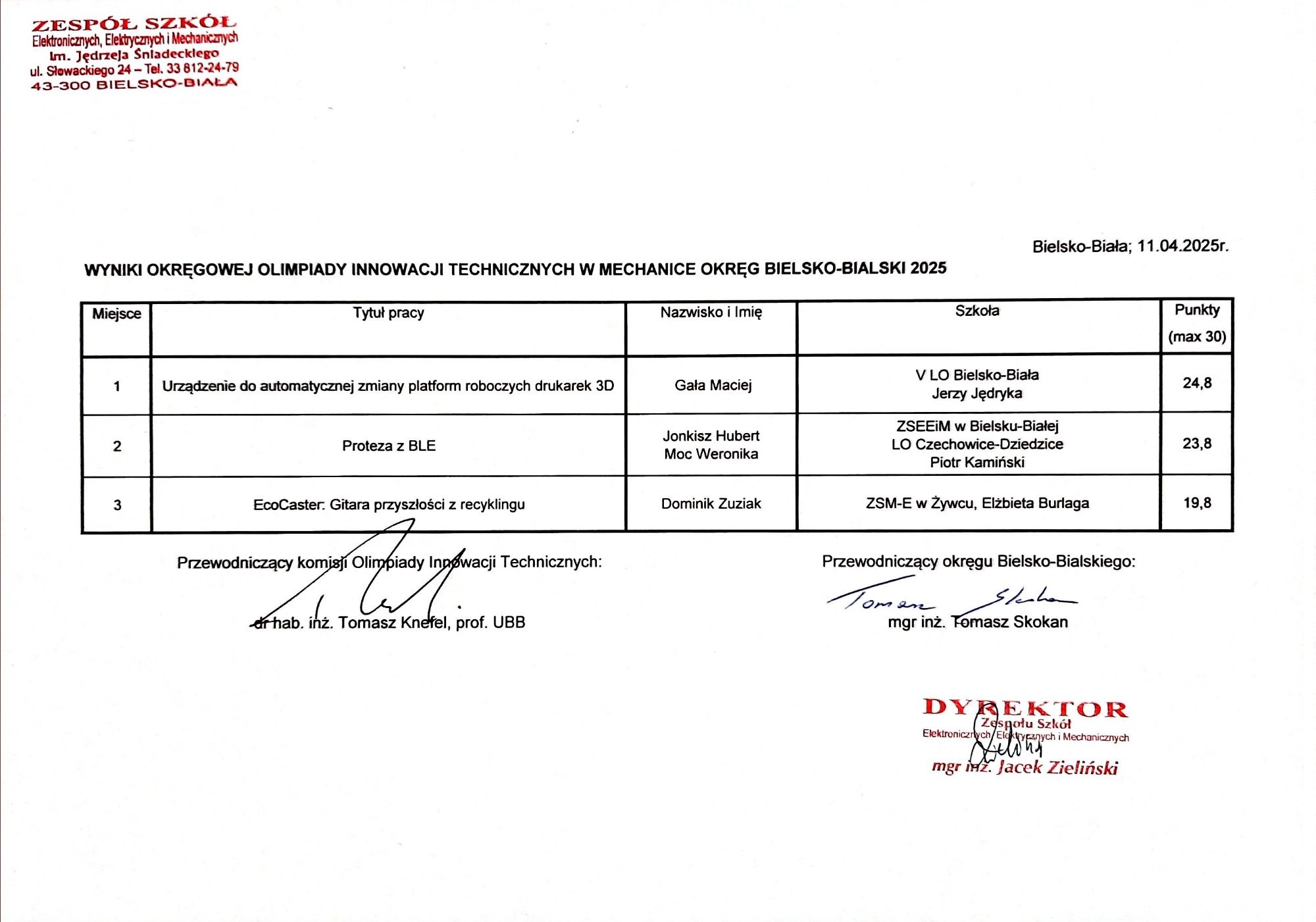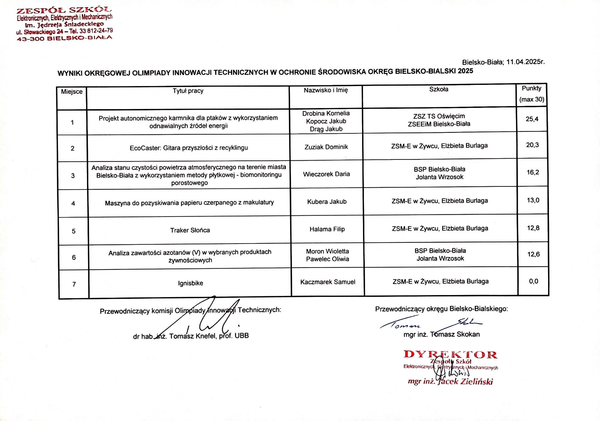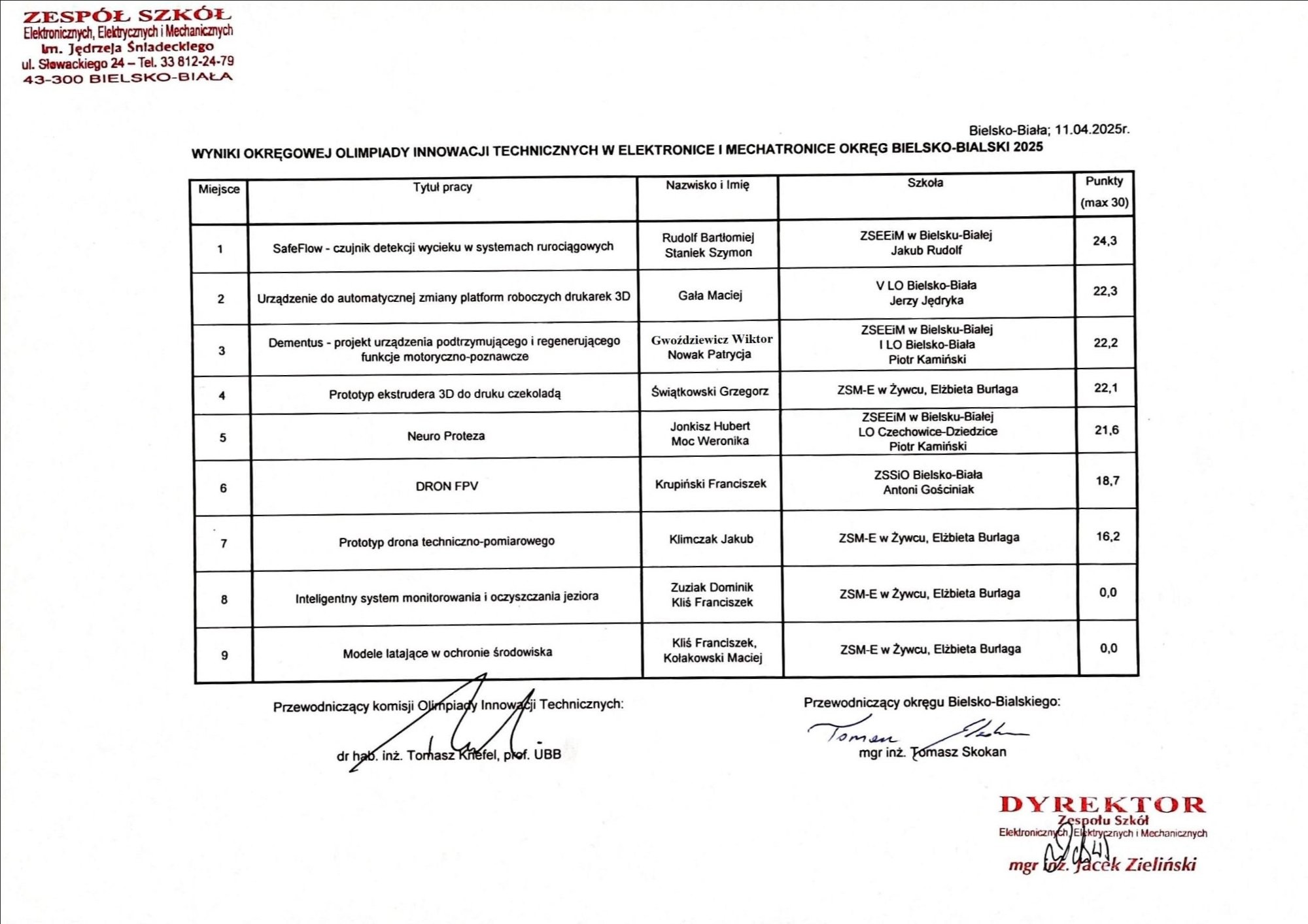 Wyniki okręgowj Olimpiady Wiedzy o Wynalazczości 2025
