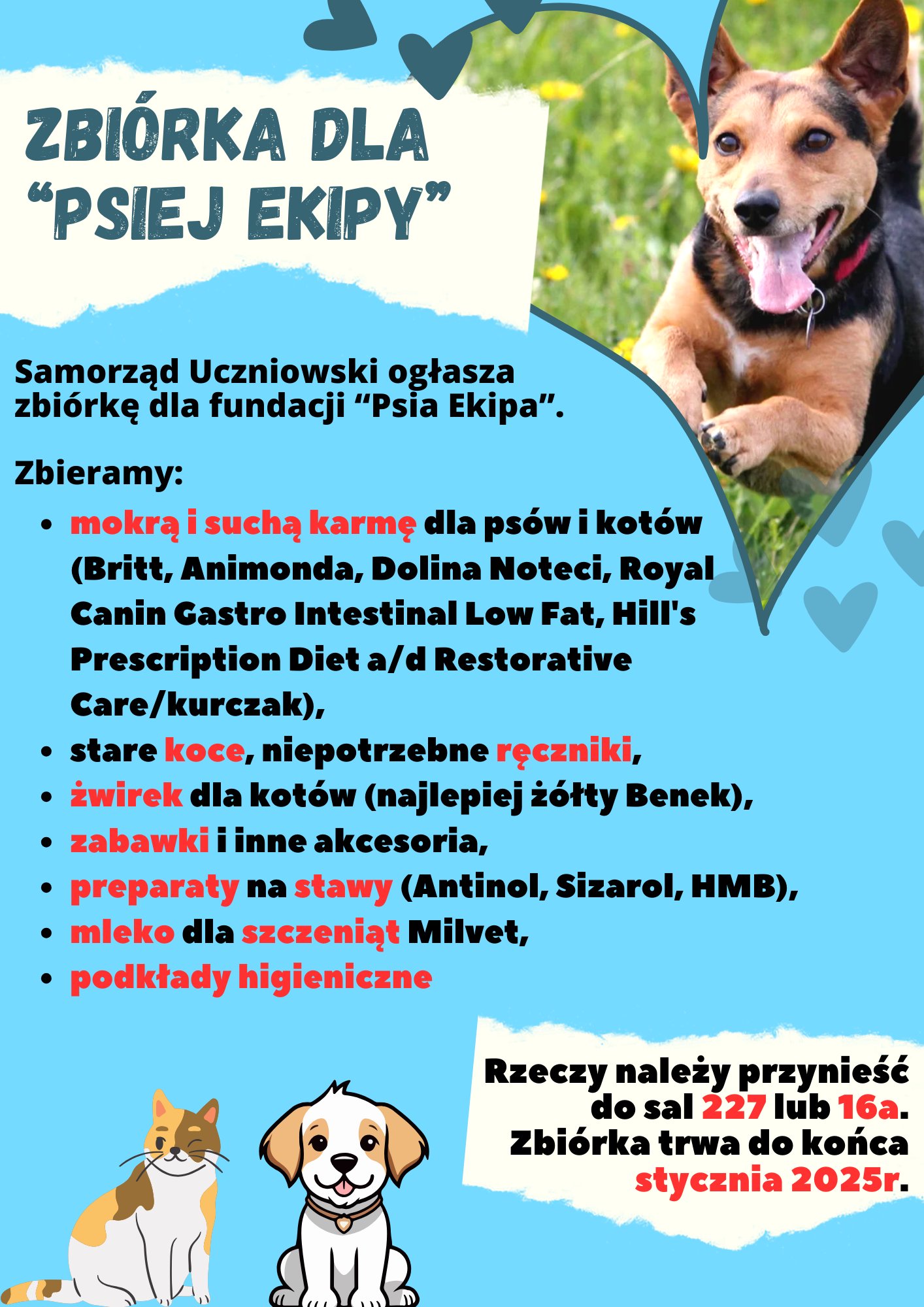 - rokrocznie wspieramy (poprzez zbiórki karmy i innych niezbędnych rzeczy) schroniska dla zwierząt oraz podopiecznych Fundacji Psia Ekipa – regularnie pomagamy potrzebującym, bezdomnym zwierzętom,